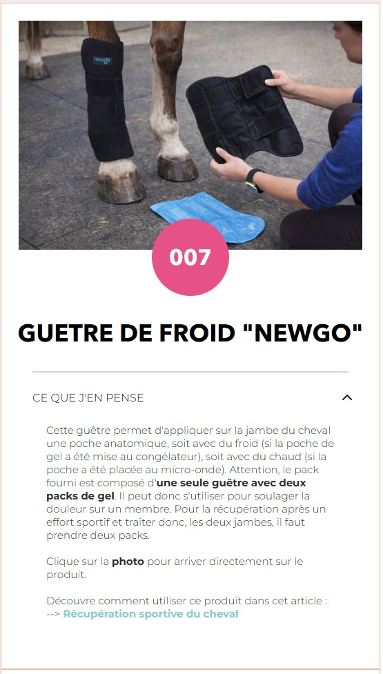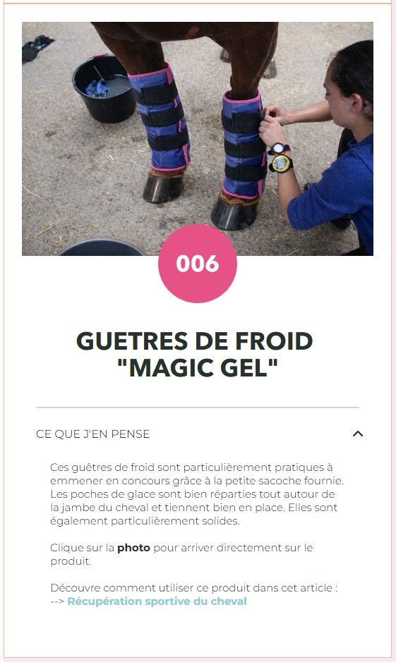 | Cet article t’a proposé plusieurs petits trucs pour favoriser la récupération de ton cheval. J’ai débuté, il y a peu, une activité de conseils pour te dévoiler mes petits tips et te faire gagner du temps dans le choix des produits. Si tu veux te les faire livrer facilement, tu peux les commander sur Amazon. Dans cet article, je parle de guêtres de froid, de bandes de repos, flanelles, argile, électrolytes. J’ai sélectionné différents modèles intéressants selon leur utilisation. Jette un œil sur les propositions ci-dessous et si un article t’intéresse, clique dessus pour aller sur ma page de détection : « les trouvailles équestres de Louise ». Avec le numéro de l’article, tu retrouveras facilement ce même produit et si tu cliques de nouveau sur la PHOTO (depuis la page des « trouvailles »), tu arriveras directement sur la page Amazon du produit ! Pour être totalement transparente avec toi, si tu achètes via un de mes liens, je toucherai une petite commission d’affiliation de la part d’Amazon (mais, pour toi, ça ne change rien, ce sera le même tarif, sans aucun surcoût). |